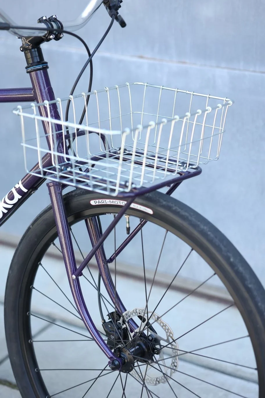 Two, low maintenance, single speed, belt drive, disk brake town and country bikes. They’re sitting on 48mm 650b tires for all road comfort and the frames/forks/racks are ready for full Honjo fenders and 42mm tires if that becomes of interest. They also have cable routing/brazeons for a rear derailleur and can easily be converted to a 1x11 drivetrain. They are fitted with custom front racks that accommodate a Wald basket. The basket is easily attached with four M5 bolts and can be removed should their luggage exceed the basket dimensions.